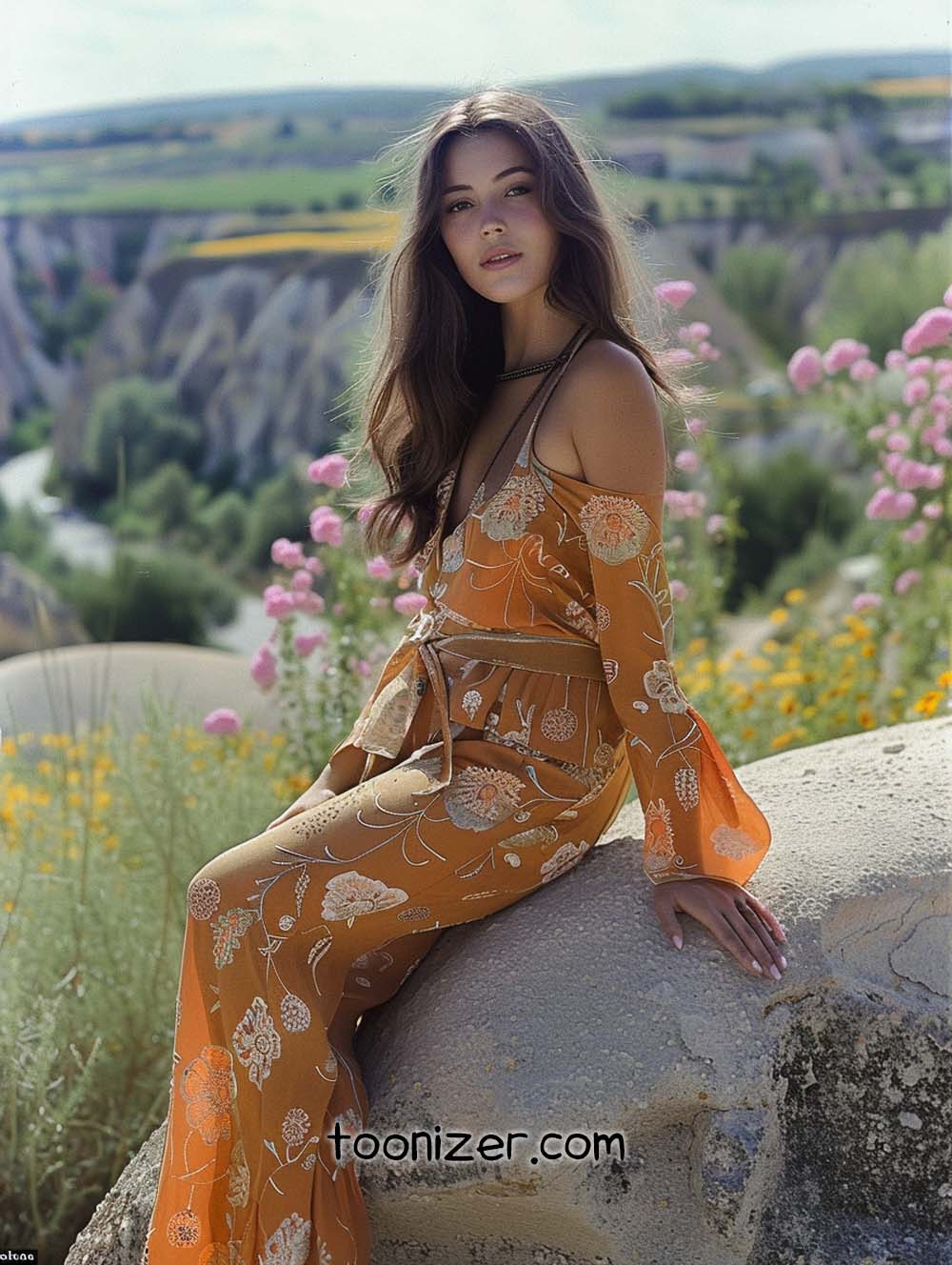 The models, draped in flowing fabrics, intricate embroidery, and bold patterns, embody the free-spirited essence of bohemian style. Their outfits, adorned with statement jewelry and wide-brimmed hats, harmonize perfectly with the earthy tones and natural beauty of the landscape. Each photo captures a moment of effortless elegance, as the models pose among the ancient fairy chimneys and panoramic vistas, creating a captivating blend of fashion and nature. The result is a collection of images that evoke a sense of wanderlust and timeless style.