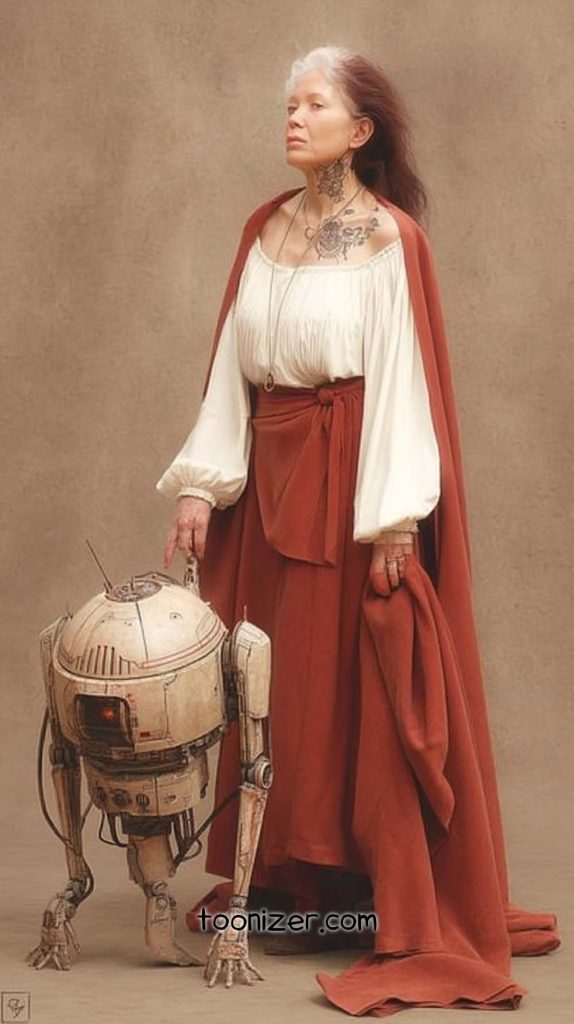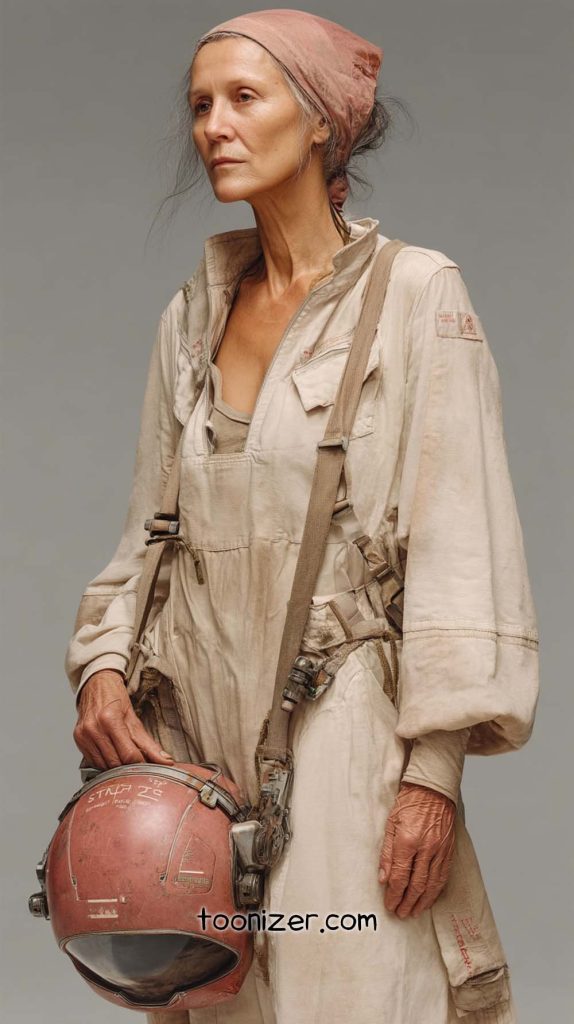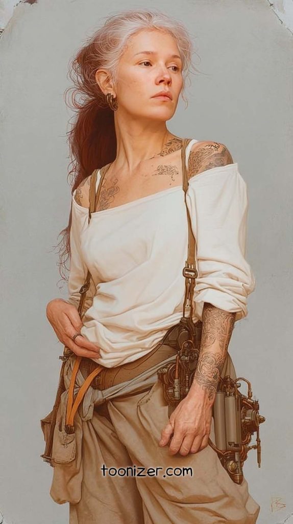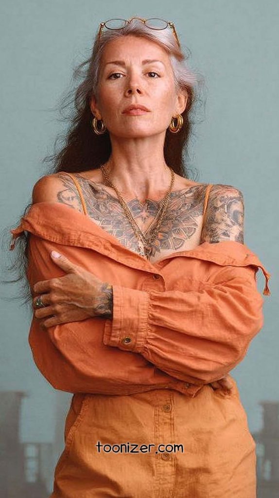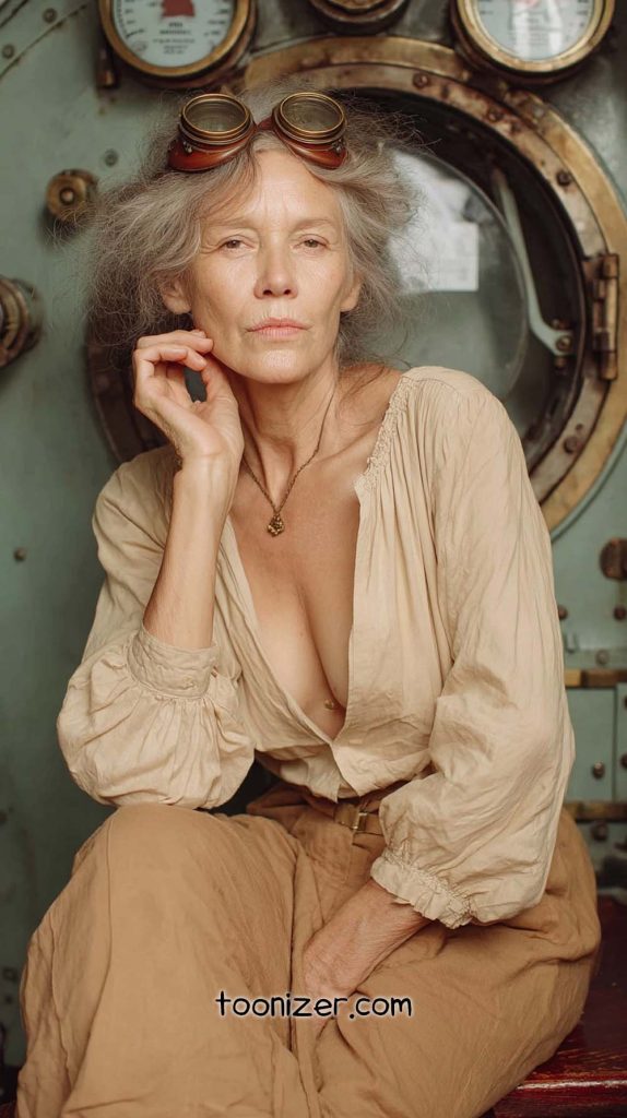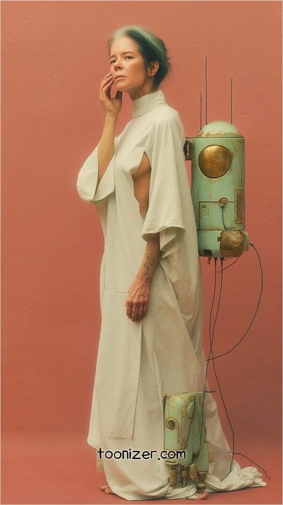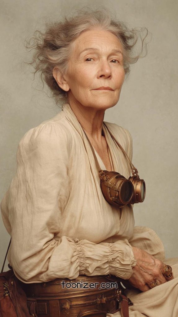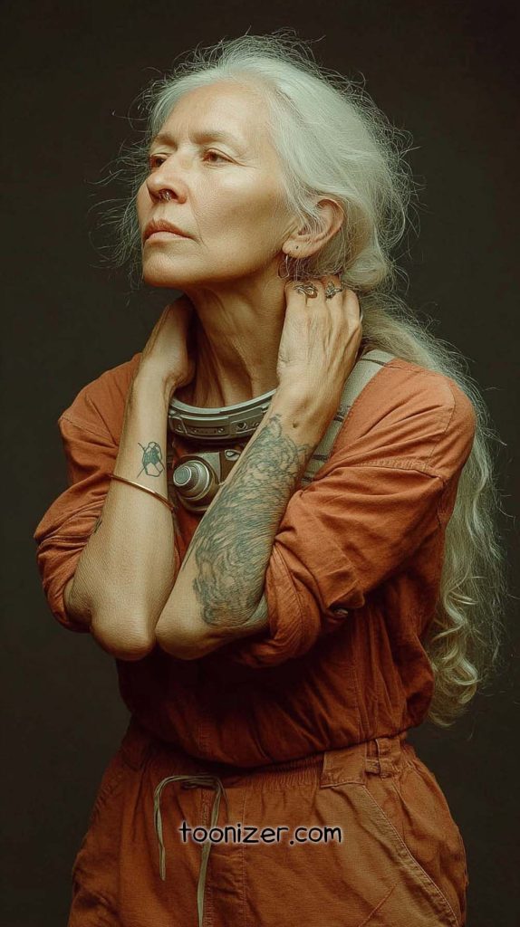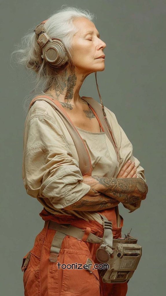 There she is—hover cane in one hand, mirrored visor in the other, metallic cape catching the light like she’s about to DJ the senior space prom. Her silver braids are woven with LED threads, and when she laughs, her smart-glasses flash a heart emoji. You both scroll through old selfies from when “futuristic fashion” was just silver eyeliner and platform boots. Now? It’s armor-meets-art, and your bestie is still serving looks that would shut down a timeline.